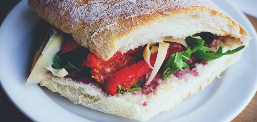 A sandwich is a food typically consisting of vegetables, sliced cheese or meat, placed on or between slices of bread .